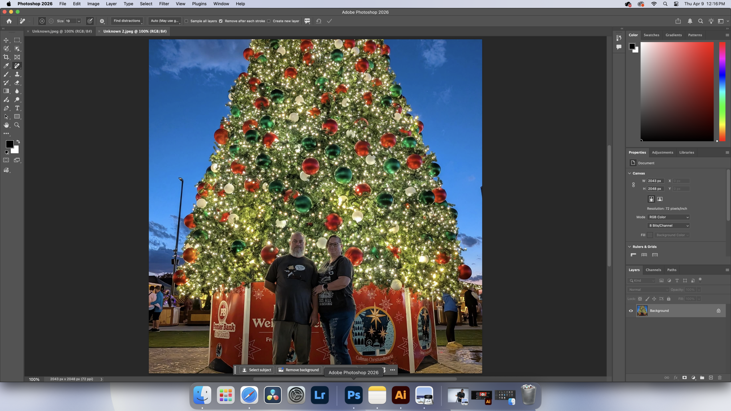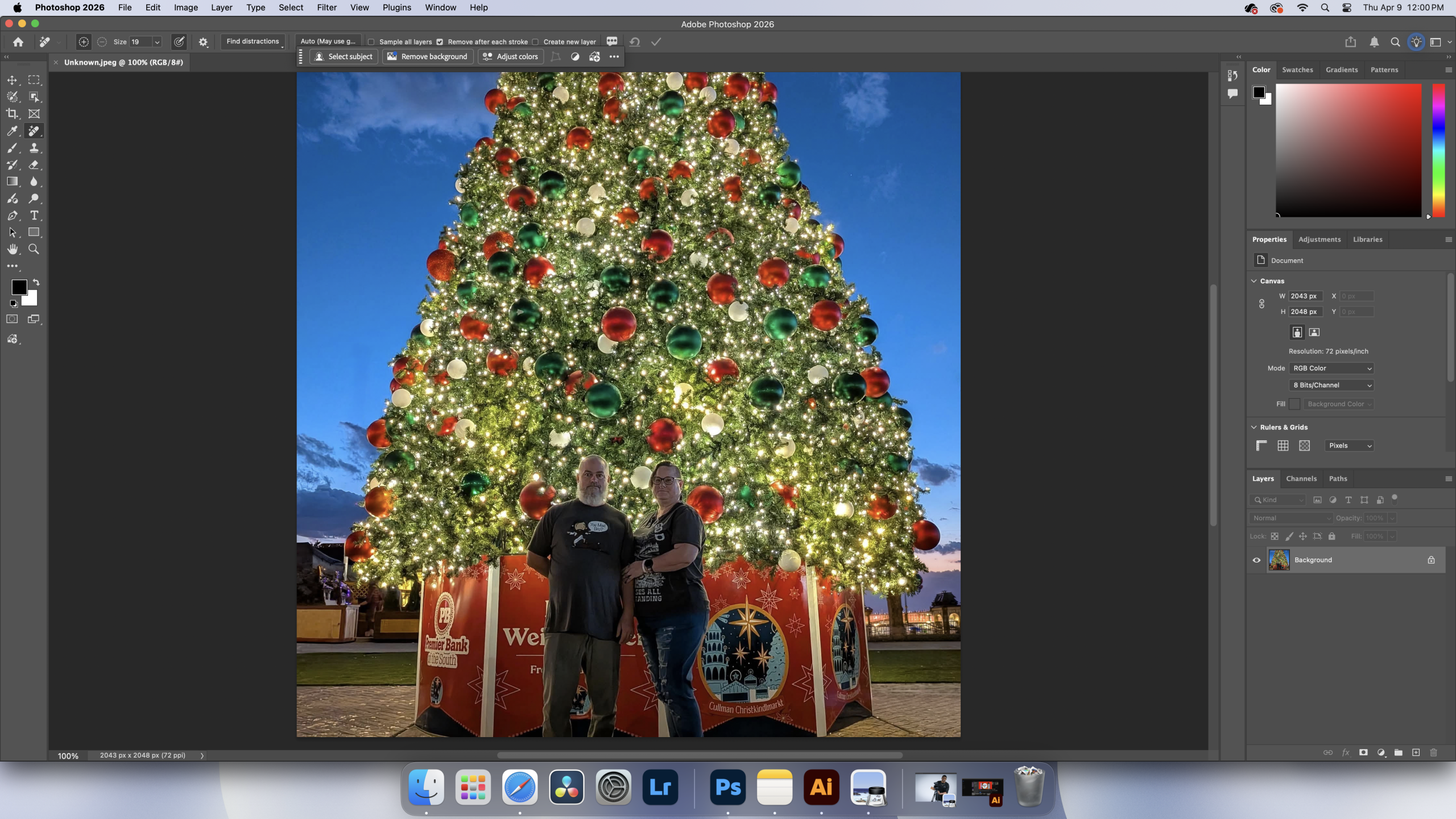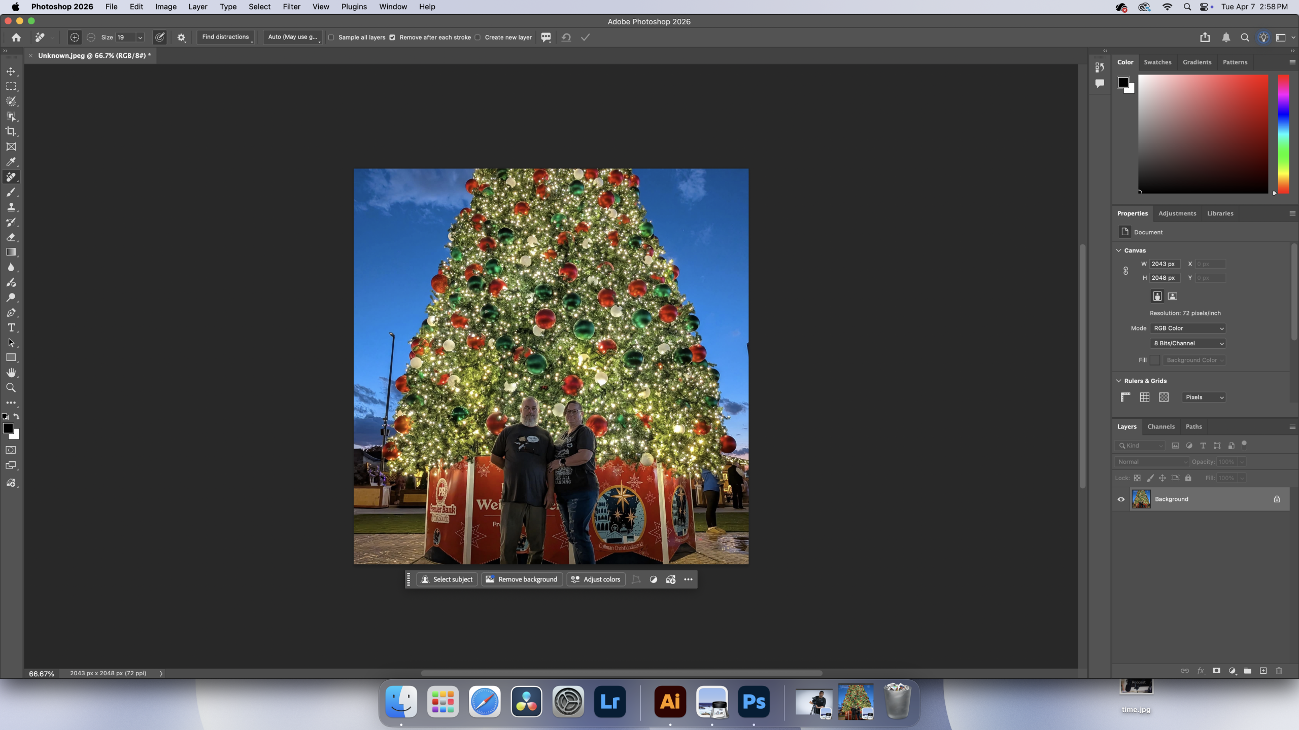 Start by loading your photo into Photoshop. As you can see, several people are in the background of this image, as well as a lamppost obstructing the skyline, and a puddle on the ground that I want gone.